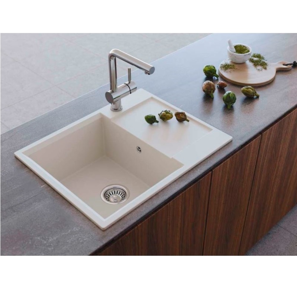 Мойка кухонная Omoikiri из коллекции Daisen 65-SA имеет размеры 650х510 мм., изготовлена из искусственного гранита. Форма — прямоугольная, одна чаша без отверстия для смесителя. Сифон в комплекте. Ширина чаши 36. Врезной монтаж. Имеется крыло.