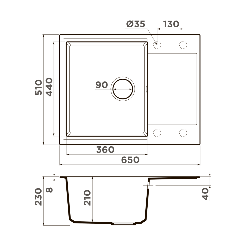 Мойка кухонная Omoikiri из коллекции Daisen 65T-GR имеет размеры 650х510 мм., изготовлена из искусственного гранита. Форма — прямоугольная, одна чаша без отверстия для смесителя. Сифон в комплекте. Ширина чаши 36. Врезной монтаж.