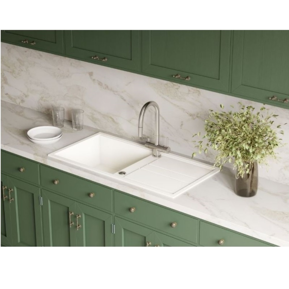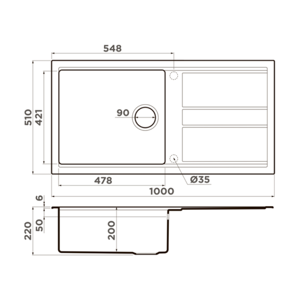 Мойка кухонная Omoikiri из коллекции Kitagawa 100-GB имеет размеры 1000х510 мм., изготовлена из искусственной керамики. Форма — прямоугольная, одна чаша без отверстия для смесителя. Сифон в комплекте. Ширина чаши 47,8. Врезной монтаж. Имеется крыло.