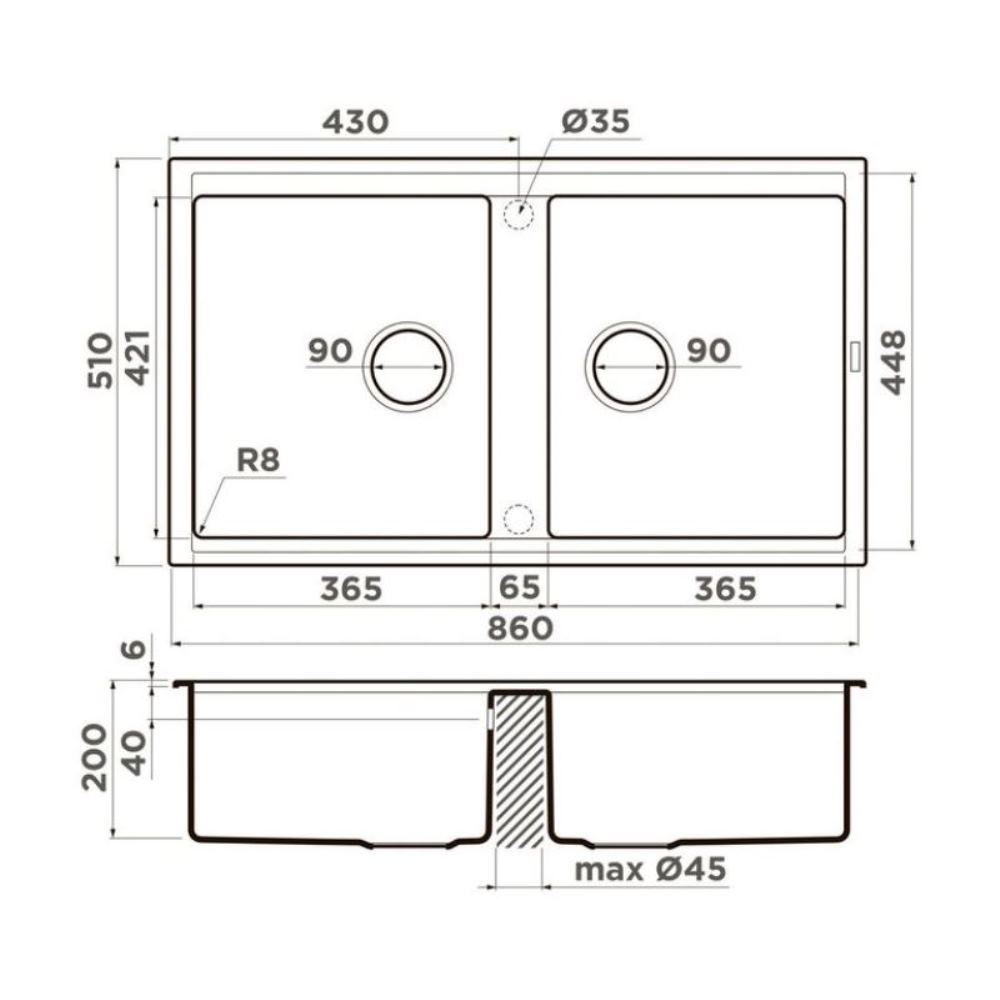 Мойка кухонная Omoikiri из коллекции Kitagawa 86-2-GB имеет размеры 860х510 мм., изготовлена из искусственной керамики. Форма — прямоугольная, две чаши без отверстия для смесителя. Сифон в комплекте. Ширина чаши 36,5. Врезной монтаж.