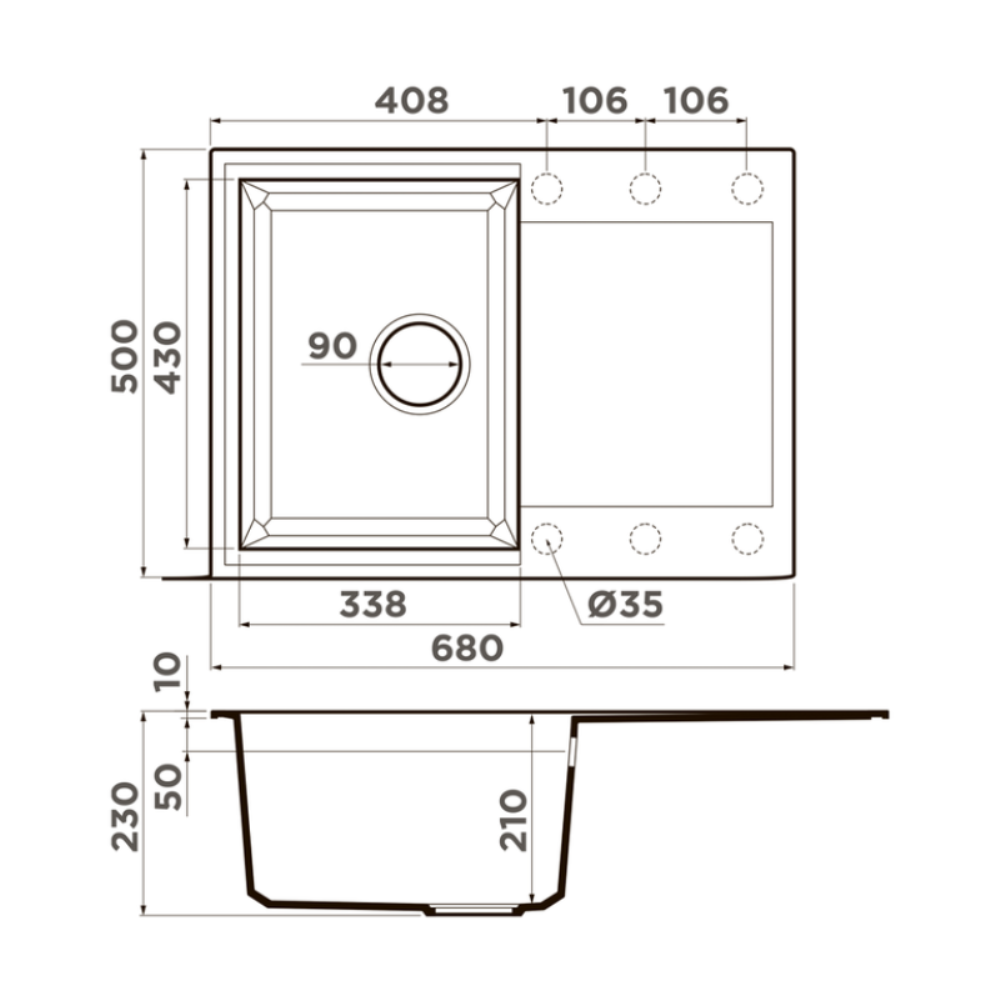 Мойка кухонная Omoikiri из коллекции Sakaime 68-BL имеет размеры 680х500 мм., изготовлена из искусственного гранита. Форма — прямоугольная, одна чаша без отверстия для смесителя. Сифон в комплекте. Ширина чаши 33,8. Врезной монтаж.