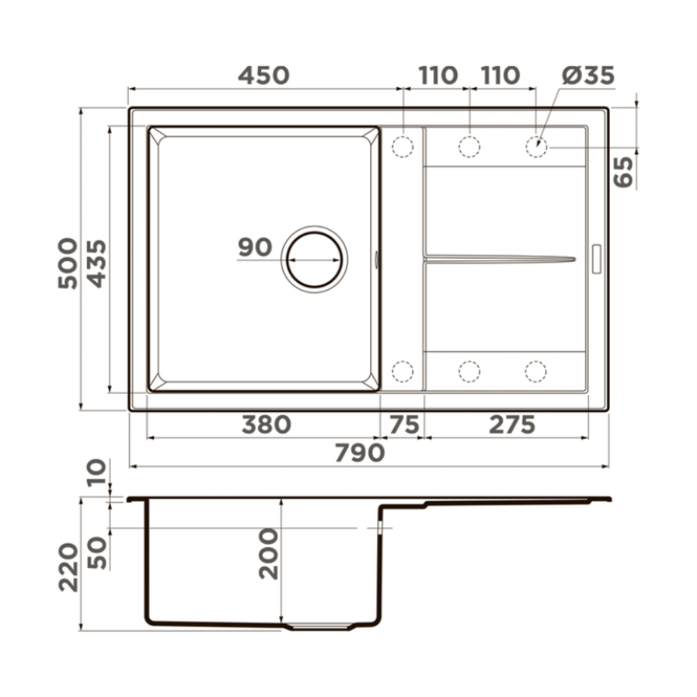 Мойка кухонная Omoikiri из коллекции Sumi 79-SA имеет размеры 790х500 мм., изготовлена из искусственного гранита. Форма — прямоугольная, одна чаша без отверстия для смесителя. Сифон в комплекте. Ширина чаши 38. Врезной монтаж. Имеется крыло.
