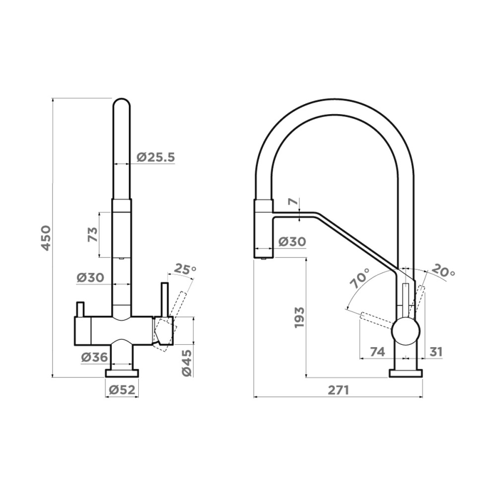 Смеситель для кухни Omoikiri Akeno с подключением фильтра оснащен рычажным управлением для регулировки температуры и напора воды. Горизонтальный монтаж на 1 отверстие. Гибкий излив 230 мм.