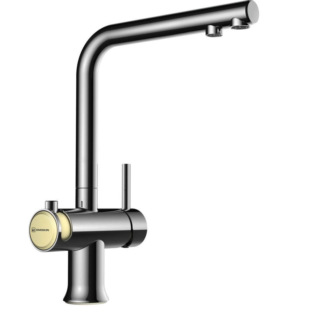 Смеситель для кухни Omoikiri Hotaru с подключением фильтра оснащен рычажным управлением для регулировки температуры и напора воды. Горизонтальный монтаж на 1 отверстие. Поворотный излив 176 мм.