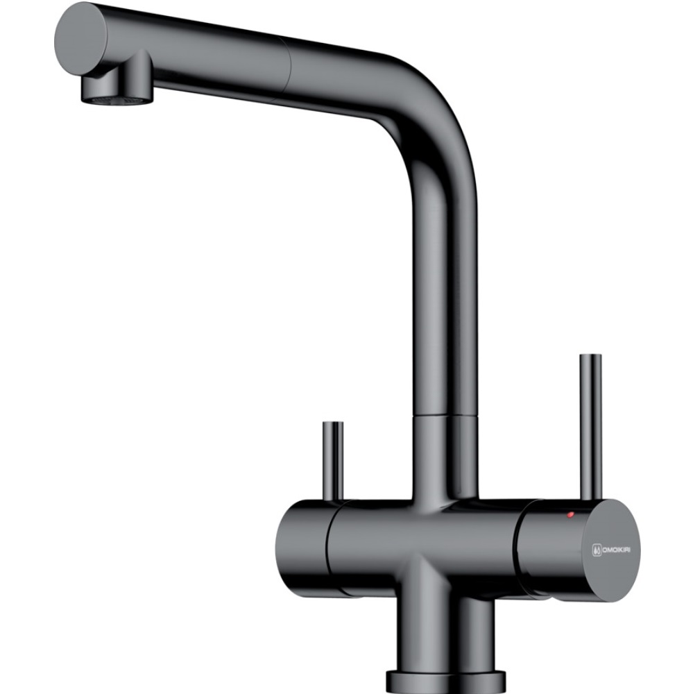 Смеситель для кухни Omoikiri Takamatsu-S с подключением фильтра и выдвижной излив оснащен рычажным управлением для регулировки температуры и напора воды. Горизонтальный монтаж на 1 отверстие. Поворотный излив 198 мм.