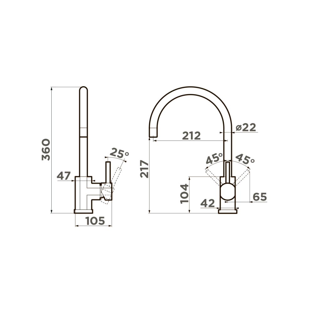 Смеситель для кухни Omoikiri Wakayama оснащен рычажным управлением для регулировки температуры и напора воды. Горизонтальный монтаж на 1 отверстие. Поворотный излив 212 мм.